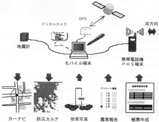 | 地方自治体では、早期地震被害予測システムに加え、高所監視カメラや防災ヘリコプター、同報通信システムなどを組みあわせた災害情報支援システムを構築している。図2は名古屋市の地震被害想定の一環で提案された将来の災害情報像である。この中には、被害情報の収集システムやインターネットを介した災害情報の提供システムなども含まれている。筆者らも、GPS・携帯電話・デジタルカメラ・超小型地震計・モバイルパソコンとウェブGISを結合することにより、災害前の広報活動から、発災時の揺れの情報の送信、発災直後の被災度・安否情報の送信、避難所・救援物資情報の受信、などを可能にする新たな災害情報端末「安震君:ANti