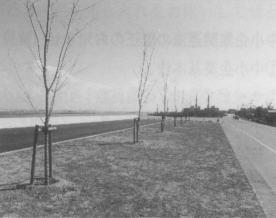 | B平成の町割会:ワークショップの風景。会場の西諸戸に集まる人々。約140名が参加 | C揖斐川右岸の整傭事業:さくら堤防の復活植樹 |
