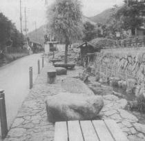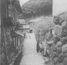 本町筋から桜間見屋の辻を西へ入ると宗砥水へ通じる石畳の坂道がある。歩くことが心地よい、ヒューマンスケールの散策路である。 | 宗祇水への入口角にある桜間見屋は飴を売る老舗。本町筋の古い町並みを引き締めている。この店の名物は、明治時代からつくられている肉桂玉。ピリッとしたニッキの味は、懐かしくファンも多い。 |