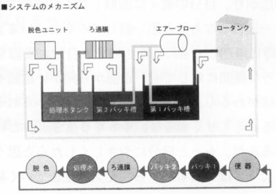 汚水をバッキ槽(バクテリア)にて水と炭酸ガスに分解させ、さらにろ過槽(0.4ミクロンの膜)にて不純物を除去し、再度流し水として利用するシステム。バクテリアの活性を促進・安定させるため、バッキ槽には多孔質セラミックスビーズ(バクテリアのすみ家)を採用、利用者負荷の変化に順応させている。浄化効率は98%と高く、汚水を分解している。また、循環水の着色をある程度防ぐため、脱色ユニットも備えており、子どもや女性が抵抗なく利用できる配慮を行なっている。(図1参照) @建屋10u未満の場合は建築確認申請が不要(工作物扱い)A浄化槽法の適用外B現地工事不要(工場一貫生産)C排水管工事が不要(手洗い水用の給排水工事は必要)D設置場所を選ばない(据置・基礎選択)E簡単に移動・移設できるF手洗い水は水道水などを使用G強制循環ポンプを採用(凍結防止)H100V電源を使用(ソーラーシステムも可能) 3穴タイプは標準便器装着では1日300回、節水便器装着の場合は1日850回利用できる。汚水浄化ユニットは3タイプを持つ(浄化槽で15人槽、30人槽、45人槽程度の能力機を揃えている)。し尿臭はない。 |