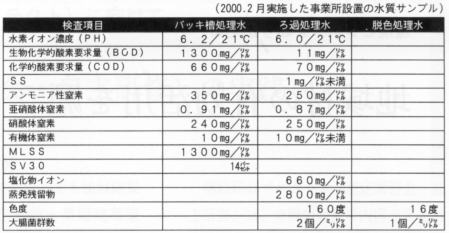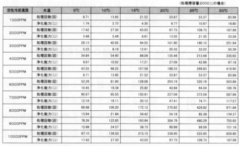 | 寒冷地でのテストを強行 | 表1 活性汚泥濃度と水温による浄化能力表 |