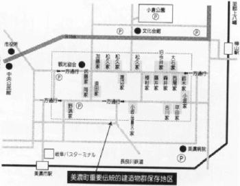 | 「うだつが上がらない」は、昔からよく使われる言葉だが、この「うだつ」が美濃市にはいまも数多く残っている。和紙問屋が多く、火事の多かった江戸時代に板葺石置き屋根の両端に防火壁を設けて隣家からの類焼を防ぐ工夫がとられた。これがいまも残るうだつである。当時いっぱしの店を構えなければうだつを上げることはむずかしかったことから、うだつは富裕商家のステイタスとなっており、その軒飾りの形・装飾性もさまざまである。現在も市の中心部には、木造の古い建物が軒を連ねているが、そのうちうだつの上がる建物が19軒も残っており・全国でも珍しい一年前から文化庁の「重要伝統的建造物群保存地区」の選定を受けている。 | 小坂家は1770年代に建てられた造り酒屋であり今日まで続いており、地酒「百春」などを造っていろ。面格子が大変に美しい建物であり、屋根は京風の切妻造桟瓦葺「起り屋根」で特異な外観をみせている。 | 今井家は江戸末期には圧屋を勤めるかたわら、和紙問屋を営んでいた。時代劇に出てきそうな帳場や座敷はどれもしっかりした造りである。最近、映画「郡上一揆」の撮影が行なわれた。また現在では建物が市によって管理されており一般に公開されている。とくに奥座敷の前庭にある水琴窟が有名である。 |