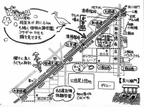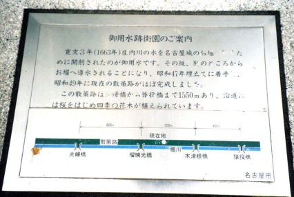 私が子どもの頃、 庄内川にかかる三階橋から黒川付近まで、 二筋の水路、 黒川と御用水が並行して流れていた。 その頃この二つの川は、 子どもたちにとって魚捕りや、 泳ぎをする格好の遊び場であった。 その後御用水は、 昭和47年から49年にかけて埋め立てられて、 御用水跡街園となり、 緑の散歩道として整備された。 夫婦橋から猿投橋までの約1.6kmは、 桜並木も美しく、 堀川の上流とは思えない緑豊かな川沿いの景観を形作っている。