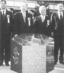 | ノーベル賞の記念碑はスウェーデン産の御影石 | ![]() 2001年12月28日に設置された野依良治教授のノーベル賞受賞記念碑。記念碑は野依さんの研究を代表するBINAP触媒のベンゼン環を模して六角形に成型されている。記念碑後方の人物は、左から伊藤副総長、野依教授、松尾総長、奥野副総長 |