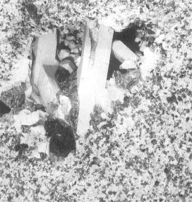 | 花崗岩マグマが地下でゆっくり冷えて花崗岩になるとき、マグマ中のガス成分や鉱物に入りにくい元素(フッ素、塩素、ホウ素、ベリリウム、リチウム、ウラン、トリウムなど)が濃集して、普通の花崗岩にはごくまれな鉱物ができることがあります。たとえば、フッ素を含むホタル石やトパーズ、ホウ素を含む電気石(でんきせき)、ベリリウムを含むエメラルド、ウランを含む閃ウラン鉱などです。 花崗岩マグマの中にガス成分が多いとガスの圧力で地下に数cmから数mの空間ができ、その空間に鉱物が異常に大きく成長することがあります(写真2)。このように粗粒な花崗岩をペグマタイトと呼んでいます。10cm以上もあるような大きな水晶、長石、雲母などの鉱物は、すべてペグマタイトから見つかっています。ちなみに、世界最大の水晶はブラジルで見つかった長さ6m、直径1.5mの巨大な結晶です。この水晶は地下数qの場所に6mにも達する大きな結晶が成長できるような広い空間が存在していたことの証拠になります。普通は地下にこうした空間がないので、鉱物が成長していく過程で鉱物と鉱物がくっっき合って、きれいな結晶面をもった鉱物はできません。世界のどこの博物館でも、展示されている大きくてきれいな水晶の標本はペグマタイトから採集されたものです。日本でもっとも有名なペグマタイトの産地は、岐阜県の恵那市から中津川市にかけての地域です。その中心が中津川市北部の苗木や蛭川村の田原で、60cmくらいの黒水晶や10pもあるトパーズが採れたことがあり、今でも一年中鉱物マニアでにぎわっています。 |