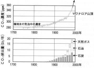 ![]() 図4化石燃料消費と大気中のC02濃度(出典IPOC95) |