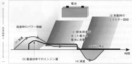 | 図2は自動車におけるエネルギーの流れを示したものです。ガソリンエンジンの熱効率はおおよそ30%です。エンジンの発熱、機械回転や摺動による摩擦損失など廃熱が1/3、排気ガスによって捨てられるエネルギーが1/3、残りの正味熱仕事といわれる1/3が自動車を走行させるエネルギーとなります。さらにエアコン、ランプなど補機に使われるエネルギーがあるため、結局ガソリンエンジンの車両全体の総合効率は15%程度と言われます。そのエネルギーは自動車の運動エネルギー(1/2MV、;Mは車両質量、V、は走行車速)に変換されますが、車を停める制動時にはブレーキの熱エネルギーとなって放散されます。 燃費を向上させる、すなわち走行中に発生するCO、を低減するためには、エンジンの効率を高める、機械損失をできるかぎり少なくするだけでなく、車両の走行抵抗(車体の空力抵抗)を低減する、車両質量を軽くする(軽量化)などさまざまな取り組みの積み上げが必要となります。これに対して、自動車が停止する際に生じる制動時のエネルギー(普通の車ではブレーキの熱で放逸される)を電池に回収するのが「回生ブレーキによるエネルギー回収」です。これを実現するには、モーターを発電機として作動させブレーキカを得る、バッテリーに回収したエネルギー(電力)を貯蔵する、必要なときにはバッテリーから電力を持ち出して走行する、など回生ブレーキシステムが必要となります。電気自動車では、充電されたバッテリーの電力を使いながら、回生エネルギーを再度充電させながら走行します。ハイブリッド白動車の設計では、バッテリーの大きさ(充電容量)をどの程度の大きさにするのがよいか子どのくらいの頻度で充電したり、発電させたりするとよいのか、これらの充放電動作をエンジン、モーターの動きがギクシャクしないようにスムーズに制御させるなどきめ細かな制御設計をすることがポイントとなります。図3はプリウスのハイブリッドシステムの動作原理を示したものです。 加速時(1)ではバッテリーから電力を供給されながらモーター走行で発進走行します。車軸の回転数が上昇すると(2)、エンジンが始動しさらに加速を強めます。平坦路での定速走行(3)ではエンジンを最適効率で運転させるため、余剰のエネルギーが出ます。これをバッテリーに充電させ、次の加速時に備えます。バッテリーの充電状態がいっぱいになったら走行中でもエンジンを止めてモーター走行に切り替えます(走行中エンジン停止)。減速時、ブレーキ時(4)には回生ブレーキにより(モーターを発電機動作させる)バッテリーに充電します。(5)もう一つの仕組みはエコランです。交差点での停車などエンジンを止める機能です。 こうしたきめ細かなエンジン、モーター、バッテリー充電の制御を行なうことで、燃費の大幅な向上を実現しています。やりくり上手なおかみさんがバッテリーという貯金箱(銀行)にお金(エネルギー)を出し入れしながら、無駄な支出を抑えている、そんな例えはいかがでしょうか? 次回は、ハイブリッドを実現したモーター、電池など要素技術について話を移します。 |