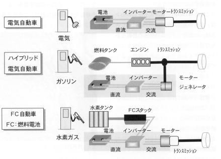 | 先回ハイブリッド自動車の燃費向上の仕組みをお話ししました。「電池がエネルギーの貯金箱として働く」ことで、エンジンを効率の良い状態で運転し、ブレーキ時の制動エネルギーを電気に変換する(エネルギー回生)ことにより、優れた低燃費性能を実現できました。この仕組みを支えているのが電池です。話に入る前に図1を見てみましょう。電気自動車、ハイブリッド自動車、燃料電池白動車の電気パワーシステムを比較したものです。タイヤを駆動するモーター、電気エネルギーを蓄える電池、電池の直流電力を3相交流に変換し、モーターを効率よく運転するインバーターの3つの電気ユニットが、それぞれのシステムに含まれています。モーター、インバーター、電池は差し詰め電気パワーシステムの御三家といえます。 | ![]() 図1電気パワー動カシステムの仕組み |