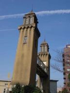 | ■紹介者コメント 松重閘門、地元では山王の水門と呼ばれ古くから親しまれています。私の中学時代の頃までは、この堀川端に材木を扱う銘木店や製材所などが所狭しと建ち並び、製材所からは一日中キーンと甲高いのこぎりの音、廃材や大鋸屑を焼却する煙が絶え間なく、結構活気に満ちた界隈でした。ほとんどが平屋か2階建ての家並みの中に、この4基の塔のある閘門は高さ約20mでそびえ立ち、この地域のランドマークとして存在していました。一見石造り風でなんとなく異国情緒を感じるエキゾチックな雰囲気が私は好きです。 1930年(昭和5)に堀川と中川運河、この2つの運河の水位差を調整しながら船や筏を航行させるために建造され、長く水運施設として活用されてきましたが、白動車が運送手段になるとともに利用も低下し、1976年(昭和51)には廃止されるに至りました。現在は、この4基の塔の中央の水位調整閘室部分を江川線、地上15mあたりを名古屋高速道路が直交し、車が絶え間なく、時には洪水のごとく流れ、時代の移り変わりを感じさせる場所でもあります。 スローライフが唱えられている現代社会、朝方には時折港方而より数多くのかもめが飛来し、その真っ白い羽に朝日があたりまぶしいくらいです。そんな清々しい景色の中、堀川の川面から船に乗ってこの塔をゆったりと眺めたいものです。 様式規模 ストー二一式鋼製扉 有効長 90.9m×有効9.1m 通行船舶 最大60t級、標準40t級 閘室容量 10隻 通行時間 最大30分 閘塔 鉄筋コンクリート製、高さ20m 4基 |