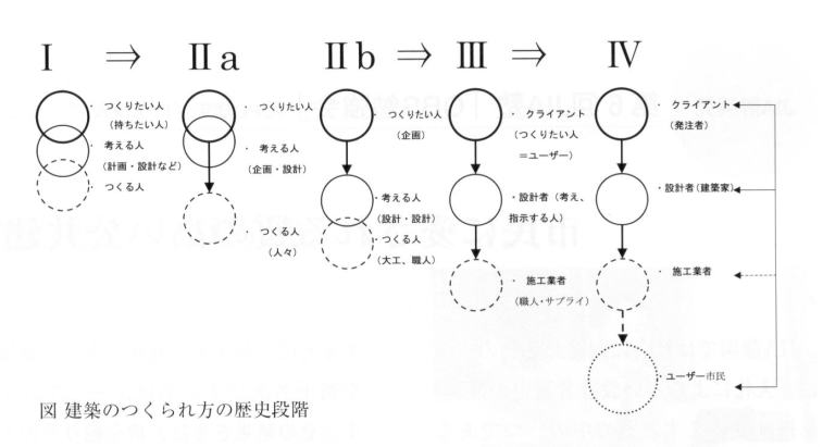 | 大学で「建築計画I」の最初の授業で、「建築家は建築をつくらない」と題して改めて「建築は誰がつくるか?」と学生に問うことにしている。黒板に「建築家は建築をつくらない」と書いてあるので、なかなか答えが返ってこない。やがて何人かが、大工とか職人とか工務店とか、実際に建築物をつくる(施工をする)職業ないし職人の名を挙げる。そこで上図のような建築のつくられ方の歴史段階の図を書きながら、「建築家」とは何か。「設計」とはどういう仕事か。設計は何をよりどころに行なうのか(行なわれるべきなのか)と授業を進める。釈迦に説法の誇りを覚悟の上で図を使って話を進めよう。 Tの段階は、エピソードあるいは古きよき時代の話で、個人というより共同体の皆でつくる。Uの段階は権カ者とか金持ちが自分のためにつくらせるようになり、ここで企画とか計画・設計という役割が生まれ、施工が分離する。Vの段階はいわゆるクライアント→設計→施工という図式である。先に挙げたように個人住宅の場合はこれで説明がつく。しかしアパートや分譲マンション、あるいは行政の発注する公共施設となるとWの図式でないと説明がつかない。この場合、「設計者」=「建築家」は発注者・クライアントにのみ顔を向けているわけにはいかない。ユーザーや市民に対して倫理的に責任が生まれる。建築家教育が欠けているとすれば、ここのところだろう。ハコもの行政とよく椰楡されるが、バブルの頃、形だけ立派で使えない(使われない)施設が各地に建てられた。その反省が「市民参加の計画づくり」と言わざるを得なくなった一因だろう。 では市民参加・住民参加でやれば万々歳かというと、ひとつ大問題がある。当の「市民」である。良い建築をつくろう、街を良い建築で埋めようというのであれば、まず、市民に「建築教育」をしなくてはならない。笠嶋氏の小論「建築教育はO歳から始まる」(本誌2002年8月号)に賛意を表すとともに、「市民参加の計画づくり」は「建築家」教育の場であると同時に「市民」教育の場のひとつであることも指摘しておきたい。 |