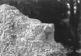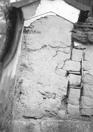 ![]() 土塀の屋根瓦が落ち、下地の泥団子が洗い出された。 自然がつくった「オブジェ」 |