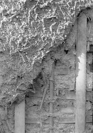 ![]() 荒壁が落ち、下地木舞が表れる |