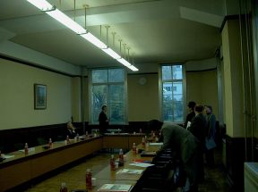 | ■紹介者コメント 建中寺は尾張二代藩主光友が藩祖義直の菩提のため、1651年に創建された。以後尾張徳川家歴代の廟所となった。 徳興殿は建中寺の敷地の中でも一番奥東側に位置している。元々は名古屋商業会議所(現・名古屋商工会議所)の本館として1896年(明治29)に栄町7丁目に竣工した。和風の大規模建築は珍しく、併設された議事堂とともに、市内における有数の建築物として威容を誇った。 その後本館は、1921年(大正10)に大池町に移築され、議事堂は一宮商業会議所(現・一宮商工会議所)に売却された。さらに、1934年(昭和9)、名古屋商業会議所新館の建設に伴い、旧本館は建中寺に売却された。議事堂および新館は現存していないが、旧本館は建中寺の大庫裏として残っている。 1991年(平成3)に老朽化により修理が行なわれアルミサッシなどに取り替えられたが、建設当時の面影を残している。渡り廊下をたどっていくと左右に配置された階段に突き当たる。この階段を上 がっていくと廊下へと導かれ、さらには500人を収容できる大広問に行き着く。大広間の天井は格天井で構成され、それぞれの天井板には葵の御紋が描かれている。一階は大小10あまりの部屋で構成され、法要、講習会などに活用されているとのことで現役の建物である。しかし維持するのは大変らしく苦労されている様子がうかがえた。 出展:愛知県教育委員会の資料 |