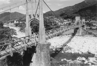 ■発掘者コメント 木曽川上流は、水量といい土地の高低差といい水力発電所の建設には理想的な地域であった。妻籠宿近くに読書発電所が建設された。この工事のために資材を運ぶトロッコ用レールが敷設され、木曽川をまたぐために吊り橋が架けられた。それが電力王といわれた福沢桃介によるものであったことから、「桃介橋」と呼 ばれている。1922年(大正11)9月完成であった。全長247m、4連の吊り橋で最大の径間は104m、幅員2,728m、木曽川の中洲にコンクリートの支柱を立て、ここからワイヤーロープを張って橋を吊るした。橋の本体は支柱とロープ以外はすべて木で造られている。洋風でアメリカの金門橋に似ている。当時はわが国最大級の吊り橋であったが、1977年(昭和52)、傷みが激しくなって、使用禁止となっていたが、1993年(平成5)9月末に復元された。70年ぶりに創建当時の美しい姿を取り戻した。少しキャシャな感じはする。そして、その年に.土木学会賞 を受けている。この橋については、桃介と貞奴の恋物語がちらついている。 また読書発電所までの導水路に柿其川をまたぐ水路橋がある。「柿其水路橋」と呼んでいる。大正12年に完成、道路と柿其川をまたぐ部分は最大スパン247mの大アーチを2連並べており、当時としては大胆であったようである。コンクリート橋をラーメン構造として築いている。これも美観を考えての決断とされている。一部剥落している部分もあるが、この水路は現役で今も水を満々とたたえて、水路橋の機能を果た している。 |