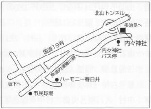 ■紹介者コメント 内々神社は、春日井市から多治見市へ抜ける国道19号の旧道沿い、内津峠近くにある。『延喜式神名帳』(927)に登載された式内杜であり、明治時代には県社という社格で、春日井市内では二社しかない、位の高い神社であった。社殿の案内板には次のように記されている。 「内々神杜の創建は古く、平安時代の延喜式に記載され、祭神には建稲種命(たけいなだねのみこと)・日本武尊(やまとたけるのみこと)・宮賛姫の命(みやずひめのみこと)を祀る。 現在の社殿は、信州上諏訪の大工立川富棟、富之、富方の立川一門によって、文化年間(1804〜1818)に造立された。 建築様式は、本殿と拝殿を中間の幣殿で連結した、いわゆる権現造りである.本殿は三間社流造。拝殿は正面に一間の向拝を構え、軒中央の唐破風と大屋根の千鳥破風の重なりが正面感を強調している。向拝の海老虹梁に代表されるように、拝殿・本殿ともに細部に多くの白木の彫刻が施されており、江戸時代後期の傾向を示す代表的な神杜社殿である。」 屋根はもともと檜皮葺きであったが、1981年にその上に銅板が被せられた。 社殿の裏にある回遊式林泉型の庭園は、南北朝時代の名僧夢窓国師(1275〜1351)の作と言われる。少しの平地と裏山の急斜面を利用し、白然の岩を巧みに取り入れて造られている。三大巨岩、とくに中央に高くそびえる天狗岩が影向石(神仏が来臨して一時姿を現す石)をなし、その下に池が掘られて、出島、中島がある。まさに立体的な美の世界であり、古くから有名であったことも頷ける。このような庭園は平坦な名古屋近辺では珍しく、貴 重なものと思う。 社殿と庭園は共に愛知県指定文化財となっている。 参考資料『春日井の神社』 所在地:春日井市内津町24 構造 :木造 竣工年:社殿 1813年 |