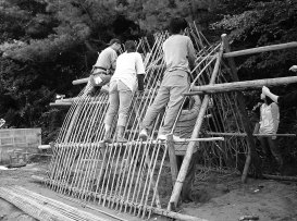 竪穴式住居の骨組みづくり |