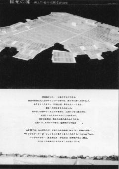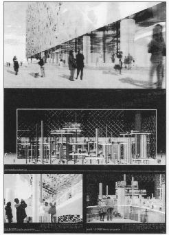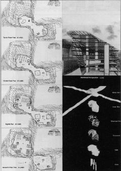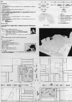| 都市の通りを川の流れにたとえ、流れ、澱み、点といった状況に置き換えて計画している。故郷の神通川の豊かな流れに学んだものから、都会のただスピードアップする人の流れに一石を投じる提案である。たとえ話の場合、筋書きのこじ付けが気になることが多いが、この作品においては無理なく受け取れる。それは作者が冒頭において神通川への熱き思いを十分に語ったことが表紙の不思議な川面の絵と重なって、見る側の気持ちを流れに誘い込むことに成功しているからだ。現実問題として公道をまたいで敷地の異なる複数の施設を繋ぐことは難しいが、そこにある既設の建物や場所が本来持っている特質をよく読み、新しい用途や機能を街のスケールに合わせてバランス良く配置している。各々の施設は丁寧に設計されており、単調になりがちな図面表示のなかで、一見してイメージダウンになりかねない着彩パースが、他の作品から識別するのに大いに効果があったことも記しておく。(廣瀬高保) | |