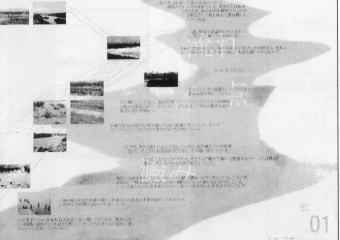 | この作品については、審査員の中にもかなりの議論があった。「建築的な提案に乏しいのでは…」というのが、主な評であった。作品は、輪中の農園に作物の通年の作付プログラムと作付の平面プランが累々と表現されている。建築システムの提案は若干あるものの、それはあくまでわき役のようである。全体的には、作物の栽培計画のダイアグラムが主である。これで建築になるのか。 私には、以前から一つの疑念があった。一時話題になった知的な人が集まっていると思われる研究・宗教施設が、ほとんどといっていいほど一木一草もない殺伐とした施設であることが不思議でならなかった。ある意味で、近代のいきつく終着駅の風景といってしまえば、ペシミスティックなSFのようであるが・・。そんな疑念である。この作品は、いわばこれとは逆な意味で突き詰めている。「作物で環境をうめつくす」ことから始めてもいいけど…作物だけでなく、他の植物も、他の動物も、そこに住む人々や、他の場所の人々の交流も…そんな願いを込めながら佳作に推薦した。(前田佐智男) |