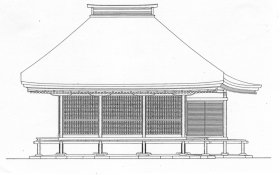 妙源寺は、三河国の浄土真宗のもっとも古い道場で、開基は桑子城主安藤薩摩守信平である。寺域は、桑子城跡にあり、西に矢作川の支流が流れ、鎌倉街道が隣接して通る。文暦2年(1235)親鸞上人が関東から帰洛する際、信平は城内の太子堂に請じて説法を乞い、その弘願他力の法を証得して帰依し、正嘉2年(1258)城域を割いて明眼寺を建立し、念信房蓮慶と称して開祖となった。その後、寺内に12坊と30余りの末寺をもつほどの隆盛を見たが、延文2年(1357)に北畠氏の兵火にかかった。以後は、安祥城主松平長親、松平清康、徳川家康などの庇護を受けて寺運を保った。 太子堂は別名柳堂と呼ばれる。方三間、寄棟造り、桧皮葺、一間向拝付、四方に擬宝珠高欄付の濡縁を巡らしている。主柱は丸柱とし、亀腹上に立て、縁長押、内法長押、頭貫を巡らし、組物は平三斗、笹繰り付、中備は間斗束とし、軒は二軒繁垂木としている。向拝は、面取角柱を礎盤上に立て、組物は連三斗・笹繰り付とし、中備に本蟇股をおき、内側に手挟みを加え、柱上に頭貫を通して両端に木鼻を出し、木鼻上に巻斗・皿斗をおいて組物を支えている。正面の中央柱間には双折桟唐戸をつり、この両脇間ならびに両側面の前2間には蔀戸をつり、背面中央間に双折桟唐戸をつり、その他を板壁としている。堂内は一つの空間とされ、中央後方では側柱筋より奥に来迎柱を立て、柱上に三ツ斗・実肘木付をおいて棹縁天井を支えている。来迎柱間では飛貫・頭貫を通して来迎壁を設け、前方に禅宗様須弥壇を出し、宮殿を安置して聖徳太子像を祀っている。柱間寸法は、桁行・梁間ともに全長24.15尺の60枝とし、柱間3間を等間隔にとり、いずれも8.05尺の20枝としており、1枝を0.4025尺としていることが分かる。これは1丈(=10尺)に25枝を配し、各柱間に1枝を4寸として20枝を配した垂木割としたものとみられ、明快な計画寸法であることが分かる。 この仏堂は、組物を平三斗とし、柱間に蔀戸をつり、天井を低く張るなど邸宅風な意匠を取り入れており、金蓮寺弥陀堂と同様に阿弥陀堂の系譜を引いたものとみてよい。浄土真宗の初期の寺院では門徒の集まる道場が建てられたが、御堂としてはささやかな仏堂が建てられた。そこでは、阿弥陀如来座像や聖徳太子立像を祀るために、阿弥陀堂形式の仏堂が造立された。妙源寺柳堂はそうした数少ない遺構の一つである。 このように、平安時代の阿弥陀堂の建築は、鎌倉時代には新仏教の中で方三間の有心堂形式として継承され、室町時代には諸仏の祠堂として受け継がれ、穏やかな邸宅風な仏堂は古代の人々の西方極楽浄土へ思いを伝えてくれるのである。 |