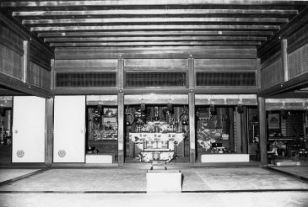 真宗本堂は、門徒が増えて道場に寺号が下付されると、堂内では本尊となる阿弥陀如来像を「内陣」の須弥壇に安置し、脇仏壇に親鸞・高僧を祀り、さらに「余間」の仏壇に聖徳太子・七高僧・名号などを祀られるようになり、いわゆる「外陣」・「矢来内」・「内陣」・「余間」・「飛檐間」などからなる真宗本堂が成立する。この草創期の建物が照蓮寺本堂(岐阜県高山市)に見られる。照蓮寺は、親鸞の門弟嘉念坊善俊により鳩谷に創立され、中野で再興され、本堂は御母衣ダム建設のため現地に移されたもので、現存最古(永正元年・1504)の真宗本堂である。本堂は、桁行7間、梁間5間、入母屋造り、当初は榑板葺きであったとされる。間取りは正側3面に縁を廻らし、内部は手前5間を「外陣」、それを中央3間、両脇2間の柱列を造って空間を分け、その奥3間半では中央間口3間を「内陣」、両脇間口2間を「余間」とするが、向かって右の室は座敷とされ、「内陣」には通し仏壇を設けるなど、道場から真宗本堂へ移行する過渡的な建物とみられる。 一方、江戸時代の前期から中期にかけて地方の堂庵が寺号を持つようになると、多くの真宗本堂が建てられるようになった。本証寺(愛知県安城市野寺町)は、三河三ヶ寺の一つに数えられる中核寺院である。本証寺本堂は三河一向一揆の際に家康に破却され、天正年間(1573〜92)以降に再興され建物である。桁行9間、梁間10間半、入母屋造り、本瓦葺、1間向拝付。間取りは、正側3面に広縁を廻らし、内部は前4間を「外陣」、奥2間を「矢来内」、その奥の中央間口3間を「内陣」、その両脇間口2間を「余間」とし、後方の側背面にも廊下を巡らしている。「外陣」では、中央3間を両脇2間とする柱列を造り空間を3区分している。このように、本証寺本堂では照蓮寺本堂に比べると門徒の序列化が進んで「矢来内」と呼ばれる空間が登場し、「内陣」に阿弥陀如来像を安置する来迎柱・須弥壇が備えられ、「余間」には脇仏壇が設けられ、「外陣」では角梁を渡しており、真宗本堂として完成した姿を見せている。 |