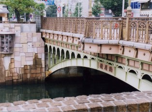 | ■ 発掘者コメント 橋は一般的に橋の上や遠景から見ることが多いが、これを川面から橋を見上げると、意外と構造力学そのものが芸術的に見えてくる。 名古屋の堀川に架かる納屋橋は、1610年(慶長15)に名古屋城の築城に伴って架設され、1913年(大正2)に鋼製アーチ橋に改築されたが、現在の橋と意匠がまったく同じであったとのこと。欄干についてみると、橋の真ん中部分(歩道部分)が丸いバルコニーのように、外へ張り出している。また、欄干に嵌め込まれたマークは「中貫十文字紋」であり、堀川を開いた福島正則の紋所である。その両脇には信長「木瓜」、秀吉「桐」、家康「葵」の紋所が並べられている。納屋橋は城下町、名古屋の隆盛の要因となったが、堀川開削の功をたたえて福島正則の紋が真ん中にきているとのことである。 納屋橋は大正2年、鋼製の飾り枝のある橋に架けかえられた。同じく堀川に架かる隣の岩井橋より10年早くつくられた納屋橋は和風な意匠といえるが、全体的に装飾が抑えられており、西洋風とも言える。アーチブリッジの上に小さな飾りアーチを連続させ、飾りアーチのリブは主桁に合わせている。また、つば(フランジ)がせりだしている高欄の上に、二本の青銅製の飾燈がつけられている。 |