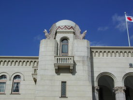 ![]() 半円形ドームの脇にある4羽の鷲などが、当時の時代背景を考慮した権威的な意匠となっている |