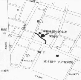 名古屋市中区のほぼ中心、西大須、上前津、東別院、そして古渡の大きな交差点に囲まれたこの街区は、社寺の門前に形成された門前町(現在は橘町)として栄え、南に東本願寺名古屋別院、北西に西本願寺西別院があり、その他10数件の社寺が現在も残っている。南北に通る本町通りの筋には、昔から仏壇街といわれるほど、大小の仏壇店が軒を並べているが、昔ほど、その数は多くはないものの、他のまちの通りとは違った趣がある。また、寺や仏壇で使われる彫物、箔屋、具店、法衣などを取り扱い、またつくっている店も多く点在していたが、これも現在は半数ほどとなり、一抹の寂しさを感じる。 その中に東本願寺西門を北へ200mほど行ったところに、この散歩道はある。太平洋戦争末期の昭和20年3月と5月の空襲にも焼失せず、仏徳の加護によるものといわれている。南門から西門へ通り抜けができる参道が、この平和を願う散歩道と名づけられ、短い距離ではあるが、西側に本殿、弁財天、地蔵堂などがあり、ぶらっと歩くと何か気持ちの落ち着くようで、私の好きな場所である。幹線道路に近いが、1、2本中へ入っているだけでこんなに静かなのだと驚く。 画一的な整備された公園が多い中、まちのポケットパーク的な存在感があり、こんな空間がもっと多くあると良いではないかと思う。やはり地域に密着しているからなのであろう。 最後に、ここは、尾張二代藩主、徳川光友公の頃、切支丹教徒の処刑場でもあったそうで、少し奥まったところに切支丹塚(別名、千人塚)がひっそりとたたずんでいる。その当時を思わせる踏み絵やマリア観音像などが境内の中にある博物館に収められ展示されている。散歩がてら足を運んでみてはどうでしょう。 |