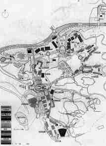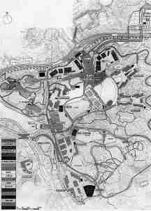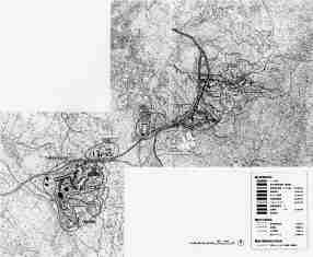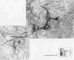 この会場地計画では、当初から検討されてきた海上の森での展開が抑えられ、愛知青少年公園が会場地の中心となる。海上の森では、わずかに造成された土地(16ha)に国と自治体のパビリオンが配置され、そこから1本の水平回廊が森を体感できる仕掛けとして延びるのみである(全長1km程度)。逆に愛知青少年公園では、既存施設(温水プール、アイスアリーナ、愛知県児童総合センター、愛知国際児童記念館)の利用も視野に入れながら、必要な博覧会施設すべてが、平場を中心に高密度に押し込まれ、さながら地方博覧会の様相を呈している。 跡地利用計画に関しては、ここに来て新住事業が白紙化され、海上の森に整備予定であった建築(研究施設、国際交流施設、研修施設、住宅等)やインフラ(新交通システム、名古屋瀬戸道路等)が見直しの対象となる。 会場地計画における、海上の森からの撤退は、跡地利用計画に見られる地域開発の見直しに起因しており、博覧会と地域開発との密接な関係が再認識できる。 |