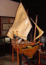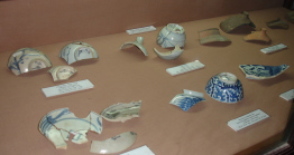 | (図7)織部焼による敷き瓦 | (図8)ベトナム・ホイアン貿易陶磁博物館 朱印船と陶磁器のカケラ |
