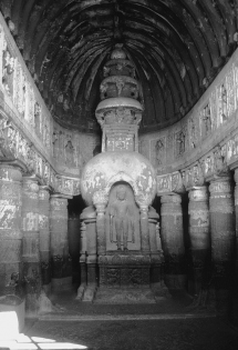 前期と後期とで空間構成が大きく異なったのはヴィハーラ窟(例:第1窟)である。広間の奥中央に前室を備えた主なる仏像のための祠堂をつくり出したことにより、石窟全体に中央軸線が生じ、また仏伝等をあらわす壁画や曼荼羅のような天井画の構成や列柱の配置等も主なる崇拝対象に対する儀式空間を意識したものへと変化した。ヴィハーラ窟が、修行僧の内向きの空間から拝殿(=広間)を持つ寺院空間へと変わったのである。さらに7世紀に比定されるエローラ仏教石窟の中には、平面形式は基本的にヴィハーラ窟と同じでありながらも、房室を持たず、仏像を並べるのみの石窟もつくられるようになった。一方、後期のチャイティヤ窟は、前期のものと基本的な空間構成は変わらなかったけれども、石窟奥のストゥーパは正面に仏像を刻み出し、ストゥーパ自体が仏像の背景になってしまった。実際にはチャイティヤ窟自体ほとんどつくられなかったのである。 後期石窟では僧のための空間が仏像を祀る寺院へと変貌を遂げた。言い換えれば、仏教の本質であった出家僧の修行があまり重要視されなくなったともいえよう。また崇拝対象として、抽象的なストゥーパより、具象的な仏像の方が世俗の理解や愛着が得られやすかったことも変化に拍車をかけた理由であろう。しかし結果としてヒンドゥーの神々を祀るヒンドゥー寺院と同等の建築様式となり、仏教建築としてのアイデンティティの喪失につながったのである。 |