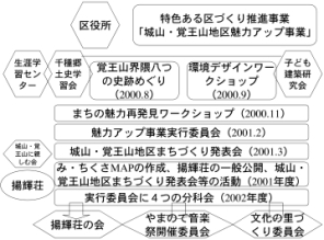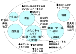 | こうした社会関係資本を育んだ上で、重要になるのが、創発的ネットワーキングである。創発的ネットワーキングとは、他のグループ・団体・組織や地域の状況・情報・知恵の共有や、実際の交流を通して、さまざまな経験を共有し、交流し、新たな知恵・方向性を生み出すものである。他とつながり、携わるというネットワーキングを通して社会関係資本を豊かにし、新たな活動を生み出すきっかけをつくっていくこと(創発)にもなる。ネットワーキングにより、刺激を与え合うことによって相互学習が可能になり、自分たちではできなかったことができるようになる。 さまざまな関心の重層が紡ぎ出す人と人とのつながり、まちづくりを進める多様な主体の連携、目標を同じくするまちづくりグループ・団体・組織の連携を通した経験交流による知恵の創発、また、地域密着型SNS(ソーシャル・ネットワーキング・サービス)などのweb2.0型情報通信技術(ICT)を活用した新しいつながりの構築など、ネットワーキングは大きな力を秘めている。この中でweb2.0型とは、「インターネット上の不特定多数の人々(や企業)を、受動的なサービス享受者ではなく、能動的な表現者と認めて、積極的に巻き込んでいくための技術やサービスの開発姿勢」のことであり、ユーザー参加、開放性・公開、公平、自律、分散、協調という特徴を持つと言われ、まさに、「まちづくり」の考え方と共鳴しうるものであり、近年では、ビジネスのみならず社会全般に大きな変化をもたらすと言われている。このように、知恵を紡ぎ出していくネットワーキングは、まちづくりにおいて重要な概念である。 まちづくりに求められる人材も、まちづくり現場の中で、まちづくりビジョンやルールづくりをリードできる人材だけではなく、まちづくりの現場における対話や討議の運営のファシリテーションができる人材、関係性を変容させ、人と人とをつないでいくようなファシリテーションができる人材、あるいは、さまざまな主体をネットワークさせていくようなコーディネーションができる人材などが今後ますます求められてくる。 さて、実際に名古屋の文化のみちエリア(図2)や城山・覚王山地区(図3)においては、多様な主体の連携による多彩なまちづくり活動が見られる。ここには、地域への想いやこだわりを持った人(地権者、地域内と地域外)がいる。そして、地域資源や社会資源をつなぐ場があり、人と人とのつながりが存在し、また、想いや関心に応じてつくられる組織や団体の重層的なネットワークが構築されている。 何よりも、こうした連携やネットワーキングを可能とするファシリテーション・マインドを持った人々が存在していることが大きい。もちろん、この地区全体での地域空間の保全・修復・創造のマネージメントという観点からは課題も多いが、こうした取組みのネットワーキングを通した交流(図4)が、現に直面する課題を乗り越えるきっかけになればと思う。 | |