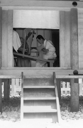 このあたりは古くから紡績業と関係が深く、服部神部という神に捧げる絹や麻を織る人々が住んでいた地です。 神服織や神麻続はいずれも大神宮に付属する神部の職名です。 服部さんという姓氏は各地に多く、特に東海地方に多いようですが、服部姓は古代の職業部の服織部から出て、この地方が発生地だといわれています。 おそらく『日本書紀』の雄略天皇の時代の衣縫の祖、漢織、呉織といった渡航の技術集団の子孫でしょう。現在もここには下御糸・上御糸・中麻続-麻生・機殿・服部などの地名があり、この地方全体が「御糸」と言われる特別の地域になり、江戸時代にはこの辺りは「松阪木綿」の名産地として有名でした。 だが今日では紡績技術は機械化し、日常着の洋風化や、新しい繊維の登場などの事情から衰退の一途をたどり、唯一の企業と、そのルーツといえる神宮の二つの機殿が残るだけとなっています。 神服織機殿神社は伊勢湾台風の以前には深い森でしたが、今はずいぶん明るくなりました。そのこんもりした森の中央に白石を敷き詰めた斎庭という広い空間があり、鳥居が一つ立っていて、その鳥居をくぐると中央に大きく立派な八尋殿があるので、そこが神社だと思い参拝する人が多いのですが、ここは機殿です。 尋とは両手を伸ばした寸法ですから、八尋殿は両手を広げた8倍の長さの御殿を意味します。もっとも八という数字は末広がりの広大なという意味で名付けられたのです。 天照大神の衣服となる「和妙」と「荒妙」の奉織は毎年5月と10月です。私も2度ご奉仕しました。昭和30年代はまだ電気がなく、ランプから蓄電池の電灯に変わった頃で、潔斎のお湯も木炭で沸かしていました。もちろんラジオも電話もなく、新聞は前日分を持ってきてくれました。 次の昭和50年代には電気とプロパンガスが入っていました。夜の森の中で、ただ一人になるとフクロウが鳴いて寂しいです。一番近い民家は森をくぐり田の畦道を300mも離れています。14日間の参籠は長かったです。 毎朝8時になると織子が出勤し神拝の上、潔斎して白衣白袴で御塩のお清めを受けて、八尋殿で作業をします。 原料の絹糸は古くから愛知県三河地方などで産する「赤引の糸」。赤引というから赤色と思われるかもしれないが、赤は赤心とか、明るく清浄な糸という意で、もちろん白色です。神宮の用語をわかりやすく説明するのは実に難しいです。2000年にも及ぶ歴史の中で祭りの変化や、奉納されるシステム、さらには時代により呼び名が変わったり、同一化されたりしているからです。 今使われている機織具はずいぶん改良されているのでしょうが、私には古代からそのままのように思われます。右手で引き綱を引くと、走板の中を横糸を通す船形の桙がすばやく走り、走板には筬が付いていて、この筬を手元に引き足を交互に踏んでカチャンコ、カチャコンと作業が進みます。両機殿の奉織は松阪市の無形民俗文化財に指定されています。 |