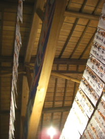 ![]() 小屋組現しの天井面、寄付金の証が柔らかな空間を作り出す。 |