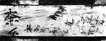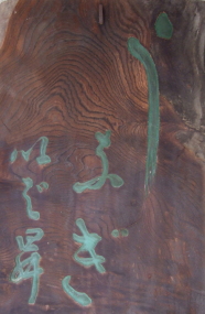 ⑨片かな 醍醐寺五重塔初層天井板落書き 九五一年頃、塔内の塗装に使われた胡粉で書かれています。一首の中に草がな、ひらがな、片かなを混用しています。「カ須七(ずな)らぬ…」「数ならぬ…」 |