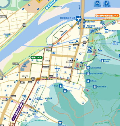 | 岐阜の観光といえば鵜飼だが、その前後で「他に見るところがない」とよく言われる。しかしそれは心外であって、長良川河畔のプロムナードの散策や、川原町から伊奈波にかけての「まちあるき」では見るべきものがありすぎるくらいである。まちづくりセンターが行った「ぎふ三十六景」では、ここで12カ所が選定されている。少し足を伸ばしたり、レンタサイクルを使えば、金華山麓の水路沿いの小道や梅林公園までたどれるルートも「岐阜市まちあるきマップ」(図3、ここでは金華のみ)では載せている。