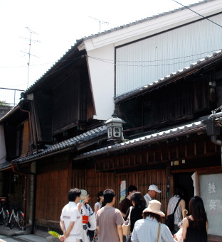 | 2007年9月、JTBと岐阜大学が提携した「シニアサマーカレッジ」でも、信長や川端文学などの岐阜にちなんだ講義とともに、半日のまちあるきをコースに組み込んだ。横浜や福岡から参加してくれた人たちは、「岐阜といえば高山」というイメージはともかく、岐阜市に何があるのかと最初は思っていたのかもしれないが、伊奈波にある元酒屋を利用したお店でお昼を食べてから、町の散策にでかけ(ガイドは、(財)岐阜市にぎわいまち公社)、最後は川原町屋でお茶をして話がはずんだ。途中で地元の人たちと気楽にあいさつを交わしていたのも印象が良かったようで、終了後の授業評価では最高の点がついたものの一つだった。