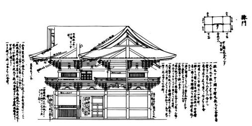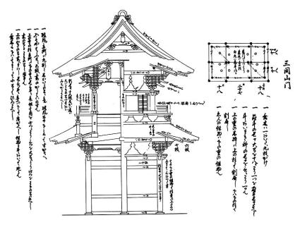 | 前回述べた「堂宮雛形」「屋敷雛形」は、建物の設計意匠を、部材寸法・部材間寸法の比例によって説明するのを主とするところから、こうした史料を木割書と呼んでいるが、その内容を建築形式別に分類すると、建物群のある敷地・境界に設置される「門」、仏塔として建てられる高層建築となる「塔」、寺院建築に該当する「堂」、神社建築としての「社」、そして武家住宅の設計手法を記した「屋敷」の5つに大別される。著名な木割書『匠明』(5巻、東京大学蔵)は、これに従うべく「門記集」「塔記集」「堂記集」「社記集」「殿屋集」と題されており、『匠明』の租本と推される『諸記集』(5冊、静嘉堂文庫蔵)では、このうち「殿屋集」が「武家記集」と題され、より直接的な題名となっている。今回は、このうち社寺・屋敷に共通して出てくる「門」の木割について述べる。 | ①「山門」の木割 ②「楼門」の木割 ③「木草門」の木割 |