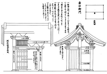 | 一口に「門」といっても、その種類は多種・多様であり、同じ形式の門であっても異なる呼び方をすることがある。それは、設計する大工が門を建築形式的に捉える場合と、社寺あるいは屋敷における宗教的意味や位置を意識して見る場合があるからである。まず、建築形式的には、 〈建築形式的名称〉棟門、唐棟門、三間棟門、五間棟門、上土門、四脚門、唐四脚門、八脚門、唐八脚門、薬医門、唐薬医門、平唐門、向唐門、冠木門、塀重門、向塀重門、高麗門、萱門、土門、埋門、一間山門(角山門)、三間山門、五間山門、一間楼門、三間楼門、平大門、大門、三間中門、五間中門、鐘楼門など 多数あるが、建築形式的にほぼ普遍的なもので、当時の大工は、これらの名称を見ただけで、どのような形の門であるか大体イメージできる。このうち最も単純かつ標準的な門は棟門で、出入口の両側に本柱のみを立て、柱上に水平の冠木を置き、通常は切妻屋根を乗せる単純な構造である。柱2本で支えるだけで前後均等に荷重を置いてバランスを保つ不安定な門であるから、大規模な屋根を載せる門には向かない。これに対し四脚門は、本柱2本の前後に2本ずつ計4本の控柱で支え構造的に安定しているので大規模な門も可能である。京都御所入口にあるいくつかの巨大な門も、その形式は四脚門である。また、間口が1間(=柱間数のこと)で控柱が4本であるから控柱を脚に見立てて四脚門と呼ぶ。これが間口3間(1)になると控柱が8本になると八脚門と呼ぶ。なお、本柱2本に控柱2本で支え、結果的に屋根の中心と柱の中心がずれるのが薬医門である。 次に、唐 が付いた門は、これが頭に付くと唐様(2)の意匠という意味で和様(3)の場合はとくに記さない。これが唐門と門の前に記されると屋根を唐破風にした門という意味で少々ややこしい。また平 が冠せられると屋根の平側の軒が正面にあるという意味で、向 が冠せられると正面に破風の形が見えるという意味で、破風の下の妻面に彫刻などの装飾が施され華やかな正面を見せることとなる。冠木門は2本の柱上に横架材としての冠木だけを設け屋根を付けない門、塀重門は屋根を付けることもあるが基本的には冠木も屋根も載せない門で、扉の重みとバランスを取るためには門の両側に塀が連なっていなければならない。長い槍を立てて通るために、武家の門として成立したものである。 以上は、いわゆる単層門の類であるが、重厚な門になると重層にする。屋根を上下2層に設け、上層屋根を切妻造ではなく入母屋造にして、唐様にしたものを山門①、和様にして間口5間にしたものを大門と呼ぶ。ただし、単層門で屋根を入母屋造にしたものは平大門である。また、重層門であるが、下層に屋根を廻さず高欄を付けた門を楼門②という。上層に鐘楼を乗せると鐘楼門である。 以上の建築形式がイメージできる門に対し、次に掲げるのは固有・独特の名称である。 〈宗教的意味や位置による名称〉涅槃門(=菩提門)、発心門、木草門(=貴惣門)、青地門、修行門、幣串門、釘貫門、薬門、海上門、鎮固門、藻壁門、皇嘉門、待賢門、仁王門、夜叉門、二天門、黄門、勅額御門、南大門、東門、西門、南門、北門など これらの名称を聞いて、その門の姿をイメージできる大工は、当時としてもごく限定されるであろう。特定の社寺や御所などのみで使用される類である。たとえば仁王門は、出入口の両側に仁王像が安置されているからで、建築形式としては、八脚門もあれば三間楼門もある。また木草門③は、妻側に破風を3つ付けた特異な門で、ありえないような形だが、歓喜院貴惣門(4)として実在している。これらの門は名称もさながら、形式・意匠も独特のものが多いが、江戸時代には実在したからこそ木割書に記されているものと察せられる。現状の遺構のみで歴史を決め付けてはならない。 |