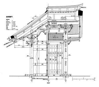 | ⑥「唐四脚門」木割の断面図 | ⑦「唐四脚門」木割の立面図 |