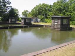 | ■発掘者のコメント 瀬戸市の中心を流れる瀬戸川を尾張瀬戸駅から多治見方面へ10分ほど車を走らせ、右折して山あいに入ると緑豊な風景に変わる。「馬ヶ城浄水場」と縦書きの表札が見えてくる。 資料によると、昭和6年に着工、昭和7年竣工、昭和8年に給水を開始している。設計者不詳、施工者石川鎌吉他4名、事業費約69万円。瀬戸市で一番古い浄水場である。広大な敷地に管理棟、濾過池、貯水池堰堤などが配置されている。管理棟は木造洋小屋平屋建て、間口7.5間、奥行き4間の長方形とシンプルなプラン。屋根は半切妻屋根(ドイツ破風)、スレート菱葺き、換気用飾り窓を設ける。外壁は腰壁付き下見板張り。南側正面中央に1.5間の玄関、西側に3間の事務所、東側に3間の寄宿室を配置したシンメトリーのデザインになっている。近年、屋根は銅板葺きに、寄宿室は展示室に改修されたが、創建当時の雰囲気は失っていない。3つの濾過池は石積み造りで今でも現役である。一日最大5,200立方メートル、瀬戸市の約1割の水を供給している。 施設側の説明によると、水の濾過には緩速濾過方式と急速濾過方式の2種類があり、当浄水場は緩速濾過方式である。濾過池は下から玉石、砂利、濾過砂の順に敷きつめ、濾過速度が1日3 ~6mと遅く、微生物の働きと自然の浄化機能を利用して濾過することから水がおいしいというメリットがある。反面、水を大量に供給するには広大な敷地が必要とされ、戦前の日本ではほとんどがこの方式だったのが、現在は濾過速度が速く、敷地面積も少なくて済む、薬品を用いた急速濾過方式が一般的になり、全国の5%たらずしか供給していない。「効率」と「安全」を考えさせられる説明であった。 |
