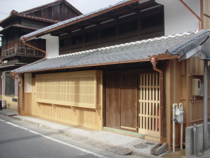 | 修理後正面。一階部分は数度の改変を経ているが、このファサードは初現 | ミセ部分内観 下屋軒桁に向かって大梁が延びる | |