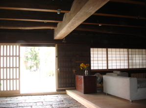 | ■紹介者コメント ある日突然、家主の柴田氏から「自宅を復原修理したい」との連絡を受けた。修理工事において、純然とした個人からの依頼は初めてであったが、「保存」と聞いた以上、逃げるわけにはいかない。登録文化財に登録することを提案し、補助事業として作業を進めることとした。 早速、調査に取りかかったが、柱傾斜は内法高さで3寸、最大沈下量は東妻壁筋における4寸であった。土台腐朽による沈下に伴い柱傾斜が生じたと推測したが、軸部修理が進んだ後の計測では、土台腐朽による沈下量は約2寸で、多少の圧密沈下を見込んでも当初の計測値と整合しない。その要因は、トオリニワの関係上、桁行方向の足固めが通っていないため、東側妻壁の足下が開いたことにあった。今回修理においては、トオリニワ部分を板張とする計画であったので、床下に根固め材を増設 することとした。 一方、解体時の調査で、当初、一階正面は西端の戸箱部分を除き、全幅開口で、戸板一枚で仕切られていたことが判明、ミセ部分を低床の応接とする計画では、さすがに復原とはいかず、写真のような柱間装置で納めた。また、一、二階座敷の床とこ面で、それぞれ明治29、38年の墨書が検出された。伝聞の濃尾震災後 の再建が裏付けられるとともに、二階の造作は再建の9年後に行われたことが知られる。 ところで、柴田家主屋では、大黒柱と正面下屋の軒桁間に大梁を渡し、隅柱間の上屋受桁をこの大梁に架けて通す、いわゆる十字梁とし、ミセ部分を無柱空間としている。尾張地方でよく見られる架構なのだが、筆者の体験では、小牧市指定文化財「岸田家」(文化年間創建:推定)にその萌芽が見られる。これらの体系化は研究 者に委ねるとして、とりあえず「尾張型」と呼んでおこう。 |
