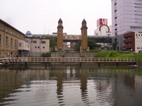 | ■発掘者のコメント 名古屋市内には81の河川(平成19年度統計)があるが、この中に中川運河は含まれない。港湾だからだ。運河の最北端、笹島の掘留は内陸部だ、ここは都心近くまで入り込んだ港なのだ。 中川運河は港湾物資を市内に運ぶ物流動線として1924年に都市計画決定し、1926年起工、1930年本線が開通した。その後、現代まで続く名古屋西南部の基盤産業と物流地帯の土地利用を誘導する基幹的インフラとなった。港とともに名古屋の母なる産業遺産である。パナマ運河に例えられる開削式の閘門運河としては日本最長で延長8.4kmある。 主な施設としては堀川とつなぐ閉鎖中の松重閘門(過去に本稿で取り上げ)、名古屋港から水位調整して運河に船が出入りする中川口閘門の他、本線に14、堀川への運河に3つの橋が架かる。他に沿岸の倉庫やそこに取り付けられた荷揚げ用のクレーンが、今は使われなくなったが、かつての水運の名残を留めている。 中川運河に架かる橋は架け替えられた物をデザインの高骨アーチが採用された橋桁構造、石積みの橋脚などに昭和初期の歴史を感じることが出来る。中川運河は、近世の運 河でもある堀川(現在は河川)とともに橋の近代遺産の宝庫なのだ。 中川運河は地表面と水面の差が少なく、橋桁が低いため、ここを通る船の背は低いのが堀川との違いである。セーヌ川のバトームシューのような照明付き観光船で橋巡りが出来たら、名古屋のナイトツアーとして楽しいだろう。 |