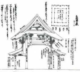 | 〈唐様の堂の名称〉唐様仏殿、徒(す) 仏殿(直仏殿・須仏殿・雨打無仏殿)、三間仏殿(雨打付仏殿)、五間仏殿、法堂、輪蔵、輪蔵堂、内輪蔵、僧堂、七間僧堂、二階僧堂、庫裏、小庫裏、大庫裏、方丈、茶堂、雪隠(西浄・東司・浄頭)、浴室(風呂)、山廊・廻廊など これらの名称も、その堂の機能的な役割を示したもので、その都度、規模や形態を考えるべき類であるが、ある程度の標準形があり、雨打無仏殿②、三間仏殿③、五間仏殿、内輪蔵、山廊・廻廊などは、全国的に類似したものが多数存在している。 〈和様または唐様の堂の名称〉鐘楼、平鐘楼、鐘撞堂、鐘楼堂、鼓楼など いずれも時を知らせる鐘または太鼓を入れる堂であるが、和様・唐様の両様式が見られる。 〈明様式〉学殿、皇帝合宮など これ以外にも、儒教建築関係の木割を記した名称が一部に存在するが、本稿では割愛する。 |