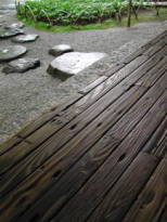 | 翌日、国宝茶席三名席の一つである如庵は、前日から降り続いた雨に濡れ、しっとりとした佇まいを見せた。徳川家光の頃より残る暦を腰貼りにし、暦貼りの部屋とも呼ばれる草庵茶室は、光の移ろいも茶室のご馳走と考えられた窓の多い茶室である。 解説のため分かれて入る7人しか共有できない、考え尽くされたその空間には内在された高い精神性を感じた。また移築保存修復に関わる数多くの苦労が見て取れる。 |