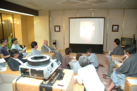 | 先生を囲んでの夕べは、先生が今までに収集された貴重なイスラム、アルジェリア、ナイジェリアの古代タイルのデザイン貼りのスライド上映会を開催。 無理にお願いしたにもかかわらず快く引き受けて下さった先生より、多く解説を頂いた。いつの時代であってもデザインに対する情熱に違いはないと感じた。 |