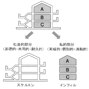 | 上述のように、時代の流れの中で役割を終える施設は枚挙にいとまがなく、またこれらの有効利用策は模索状態にある。しかし、集合住宅に目を転ずれば着目すべき取り組みがこれまでなされてきた。 1970年代後半、我が国では住宅を対象とし二段階供給方式(図1)が開発された。これは住宅を社会的部分(スケルトン)と私的部分(インフィル)に分け、前者を公共、後者を居住者が計画・建設・供給を行うというものである1)。このねらいの第一は「生活的社会資本形成」であり、スケルトンの長寿命化により実現される。ねらいの第二は開発当時の計画課題であった「居住者の多様な住要求への対応」であり、インフィルの設計自由度確保により実現される。従来の住宅では、これらスケルトンとインフィルが一体的に計画されていたため、インフィルが生活に適合できなくなったがゆえに、いまだ物理的寿命の尽きていないスケルトンも解体され、逆にスケルトンの制約の中でインフィルの設計、つまり居住者の生活が制約を受けるという不具合が発生していた。二段階供給方式は、これらの問題点を解消しようとしたものであった。 その後さまざまな事例が具体化したが2)、この考え方は1990年代後半においてはSI住宅、直近では200年住宅として発展を遂げ、そのねらいも住宅の長寿命化に力点が置かれるようになった。 さて、二段階供給方式と次回以降に述る大規模商業施設やホテルとの関係で施設に関して二段階供給方式のインフィルを「用途」と読みかえ、時代と共に変化を余儀なくされるインフィルに無理なく対応できるスケルトンを計画することにより、建築全体を長期たり有効に機能させるという発想に 基づいている。実際これらの施設では、比べ格段に大きく、またインフィルに係わる社会や市場環境の変化が激しい点で、二段階供給方式の考え方は住宅よりもむしろよく当てはまる。 |