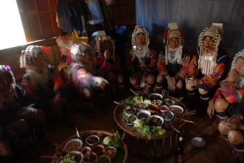 | 雨季と乾季が繰り返されるモンスーンアジア。その中央に位置するタイ王国。北部には山地が連なり、その尾根線はミャンマー(前ビルマ)との国境になっている。 今から十数年前。国境付近にある、アカと呼ばれる人びとの村をはじめて訪れて、しばらく滞在したときのことだった。住まいの特徴とそこでの暮らしぶりを目にしたわたしは、アカの男性と女性はきわめて対照的な存在であるとの印象を抱いた。 棟持柱構造で入母屋の大屋根がかかるアカの住まいは、地面から2メートルほどの高さのところに床面がある高床式でもある。その内部は一枚の壁によって双分されており、ふたつの居室を男女がそれぞれ別々につかう。ふたつの居室はほぼ対称形で、谷側に蒲団やベッドのある寝室空間があり、山側には炉が切られた調理・食事空間がある。男性は手前側の居室で起居し、食事もそこでする。いっぽう、女性は奥側の居室で起居する。食事は、男性側で男性たちにまじって取ることもあるが、基本的には女性側で女性だけで済ます。禁止されているわけではないので、それぞれの居室の行き来もあるが、頻繁というほどではない。男性側の炉では、毎食、おかずをつくり、女性側の炉では飯を蒸す。男女それぞれの居室にはひとつずつ入り口がある。 住まいに加えて、人びとの日々の暮らしぶりも、わたしが抱いた印象を補強する。多くの男性は、毎朝、村の中心にある広場に集まり、熱心に話をする。話題は、その時期の農作物の作況やその日の仕事の分担、地方行政にかかわる仕事や用事、伝統的宗教を覆い尽くそうとするほどに波及してきたキリスト教への対応など、多様である。なかには、激しく議論する人たちもいる。そうした集まりを遠くから眺めていた女性たちは、じきに農具を担いで畑仕事に出かけて行く。男性たちは、日が高くなるころに、やっと議論を終わらせて自宅に戻る。だが、皆が妻や娘の後を追って畑に向かうわけではない。一日中自宅で過ごしたり、よそに遊びに行ったりする男性も多い。 町に買い物に出かけたり、役所でなんらかの行政的手続きをしたり、あるいは村のなかの公の場に顔を出したりするのは、たいてい男性である。女性は、食事をつくり、洗濯をし、暗くなるまで畑を耕したり作物を収穫したり、家畜に餌をやったりするなど、労働の大半を担う。男性が外で政治的活動や社会関係の構築にいそしむ代わりに、女性は、自宅と畑地で黙々と労働に従事する。特徴ある住まいに加えて、こうした日々の光景をたびたび目にすれば、おそらくだれもが、この社会では男性と女性はきわめて対照的な社会生活を送っていると考えてもおかしくはない。 |