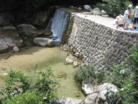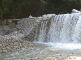 | 練石積堰堤(8月16日) | 練石積堰堤(9月9日)。豪雨によって一部破壊され、流出した岩がころがっている | 空石積堰堤(9月9日)。水量が多いため、岩は隠れている |