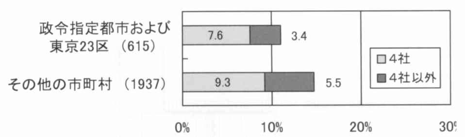 | 2003年半ば、店舗閉鎖の動向を調査した。上記3社に1998年頃から赤字店舗閉鎖を本格化したダイエーグループを加えた4社について227、それ以外で127、計354の店舗を抽出した注1)。また、店舗閉鎖の地域特性を把握するために、各地域の総店舗数に準ずるものとして日本ショッピングセンター協会の店舗数注2)を用い、閉鎖店舗数の全体に対する割合(以下、店舗閉鎖率と略す)を求めた。 店舗閉鎖率(図1)は「全体」の14%(8.9%+5.0%)であり、地方別では北海道・東北・北陸・九州などの三大都市圏を含まない地方圏で高くなっている。この内訳を4社/4社以外でみると、4社以外の占める割合の大きい地方も見られ、店舗の閉鎖は4社以外のチェーンでも起こっている。 また市町村別(図2)では「その他の市町村」の方が店舗閉鎖率は高く、これらのことから、大規模店舗の閉鎖は「地方の問題」としての色彩が強いことがわかる。 |